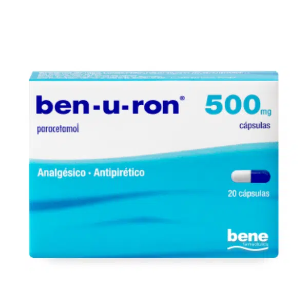 ben-u-ron® 500 mg cápsulas está indicado para adultos e crianças com idade igual ou superior a 12 anos, no tratamento de sintomatologia associada a estados gripais; febre (com duração inferior a 3 dias); reações hiperérgicas da vacinação; dores de cabeça, enxaqueca com diagnóstico médico prévio, dores de dentes, de ouvidos, menstruais, traumáticas, musculares e articulares, de intensidade ligeira a moderada. Está contraindicado na doença hepática grave e na hipersensibilidade ao paracetamol ou a qualquer um dos componentes. É necessária precaução nos doentes com insuficiência renal moderada e grave, insuficiência hepática, hepatite aguda, doença de Gilbert, tratamento concomitante com medicamentos que afetam a função hepática, deficiência de glucose-6-fosfato desidrogenase, anemia hemolítica, alcoolismo, desidratação e malnutrição crónica. Medicamento não sujeito a receita médica. Leia atentamente o folheto informativo e em caso de dúvida ou persistência dos sintomas, consulte o seu médico ou farmacêutico.