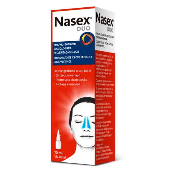 Nasex Duo, xilometazolina + dexpantenol. Medicamento indicado: na redução do inchaço da mucosa nasal na rinite; tratamento auxiliar na cicatrização de lesões das membranas mucosas; alívio na rinite vasomotora; tratamento da obstrução nasal após cirurgia ao nariz. Não utilizar durante mais de 7 dias. Contraindicado em caso de hipersensibilidade aos componentes e em crianças < 6 anos. Utilizar com precaução após: tratamento com IMAO ou outros medicamentos que aumentam a pressão arterial, pressão intraocular elevada, doenças cardiovasculares graves, feocromocitoma, distúrbios metabólicos, porfíria e hiperplasia da próstata. Na rinite crónica utilizar sob supervisão médica. Não utilizar durante gravidez/amamentação. Leia cuidadosamente o folheto informativo. Em caso de dúvida ou de persistência dos sintomas consulte o seu médico ou farmacêutico.